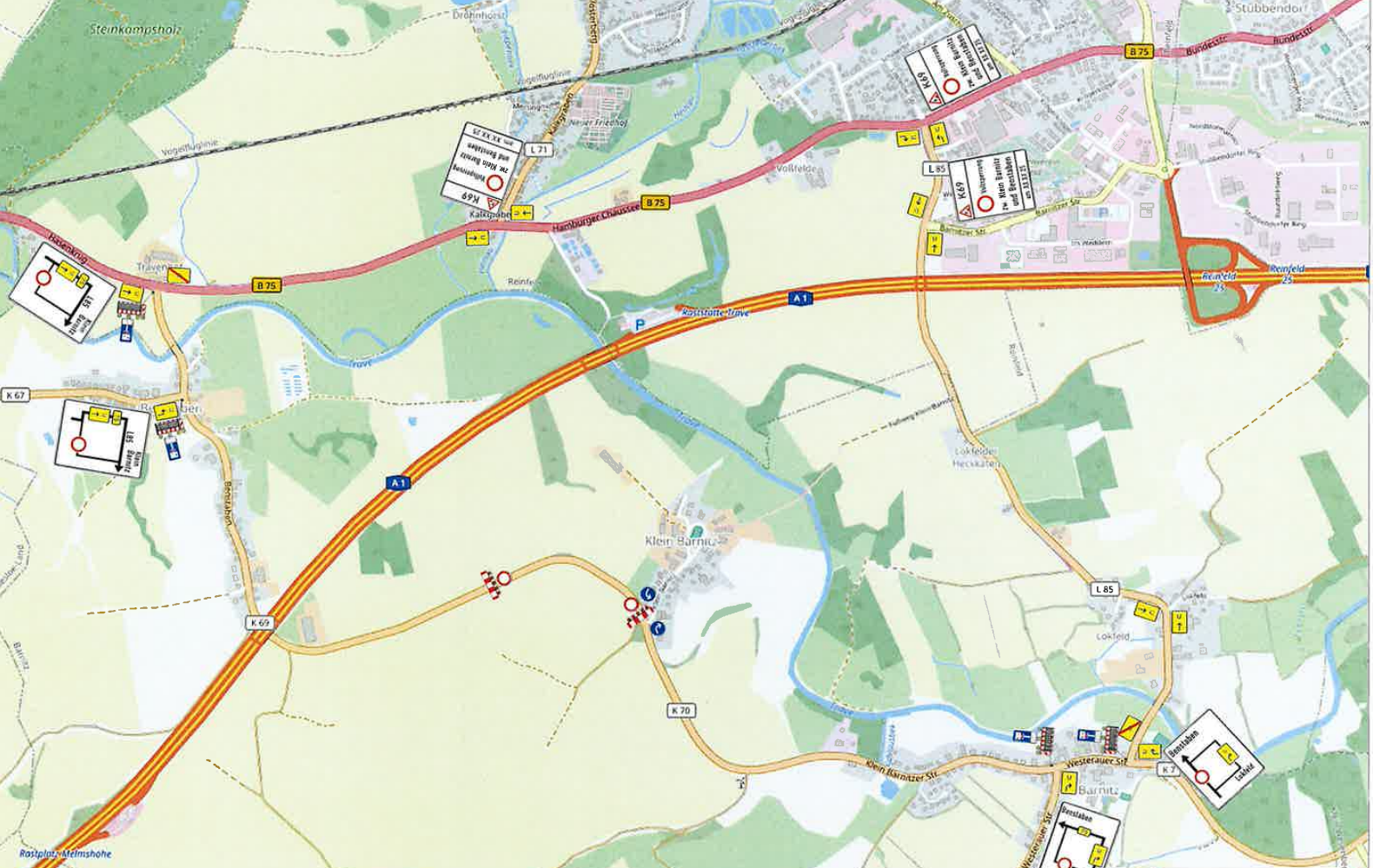 Die Arbeiten sollen ab 20.10.2025 beginnen und bis zum 24.10.2025 beendet sein. Aus Gründen der Verkehrssicherheit und des Arbeitsschutzes können die Bauleistungen nur unter Vollsperrung stattfinden. Für den überörtlichen Verkehr führt die Umleitung ab der Kreuzung der K 67 / K 69 in Benstaben zur B 75 bis Reinfeld und über die L 85 nach Barnitz und umgekehrt.