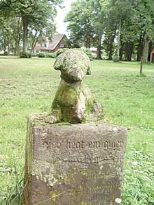 Das Grab eines Hundes bewacht ein arg verwitterter steinerner Artgenosse.